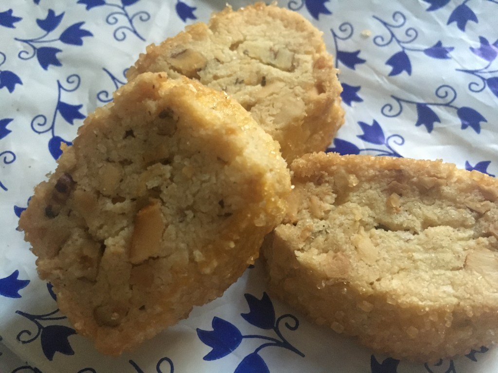 A few years back when I lived in Cairo for my job, I found these wonderful walnut biscuits at the deli next to my house. They were so good, perfect for my morning coffee or an afternoon break and sometimes both, and reminded me of my childhood – a kind of comfort food. Growing up with a Scottish mother, shortbread was a bit of a staple, especially in the cold Canadian winters and at Christmas. These walnut biscuits or cookies were basically just shortbread with nuts baked in. I’m not sure how they made it to Cairo but they do like their nuts there as in many parts of North Africa and the Levant. Many traditional sweets feature nuts, especially almonds and walnuts. In any case, now in Sardinia with nuts making an appearance in the winter market, I found myself missing these biscuits with my morning coffee so I recently dug out my old family shortbread recipe and did a little experimenting. Pretty pleased with the results – rolled in coarse sugar, these sophisticated nut shortbread cookies are long on nutty, buttery flavour. But be warned! They are addictive and a family favourite so will disappear fast!