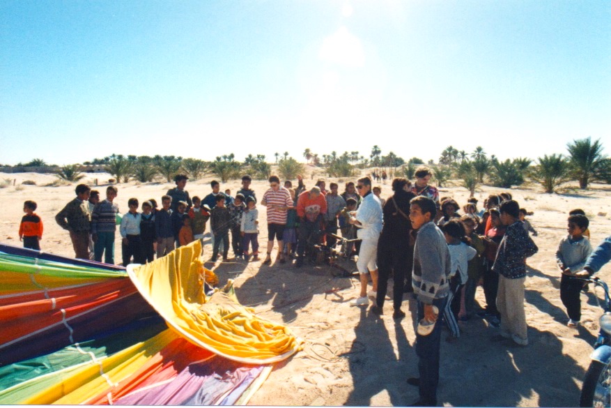 Although only there for a short while, I got around a bit. I discovered it was a short journey to both Carthage and to Hammamet by train and had lots of weekend day trips to the seaside. Around Christmas, I also took a local long distance shared cab south to the desert with a friend. What an adventure! 3 Senegalese people joined our cab south and I don’t know what oils they used on their skin but they smelled heavenly and laughed the whole way wrapped in their colourful cloths. We spent some time in and around Tataouine where they filmed parts of Star Wars – incredible place and landscapes – and spent a night in the below-ground “cave dwellings” of the native Berber people, designed for coolness and protection. These were giant holes in the ground with layers of caves, maybe 3-4 stories high, surrounded by rolling hills filled with wild rosemary. Stayed a few nights in other places on the edge of the desert too, eating couscous, huddled by the open fire listening to the drums. Such a special place the Sahara desert and I’ve been fortunate to spend time in it in Tunisia, Algeria, Morocco and Egypt. I think it was also around the time that The English Patient came out which only added to the romance. The most spectacular memory though was a hot air balloon ride over the desert. This was in the late 90s so not a lot of tourism still and we just by chance got chatting to some French folks at a local cafe who said they did hot air ballooning. So calm and peaceful. It was like meditating, just floating through blue skies, across the golden dunes which stretched as far as the eye could see under the shade of the colourful canopy. We came to land on the outskirts of a tiny village and as we descended hordes of children emerged and started chasing us, laughing and calling out, surrounding us with their happy, excited faces as we landed.