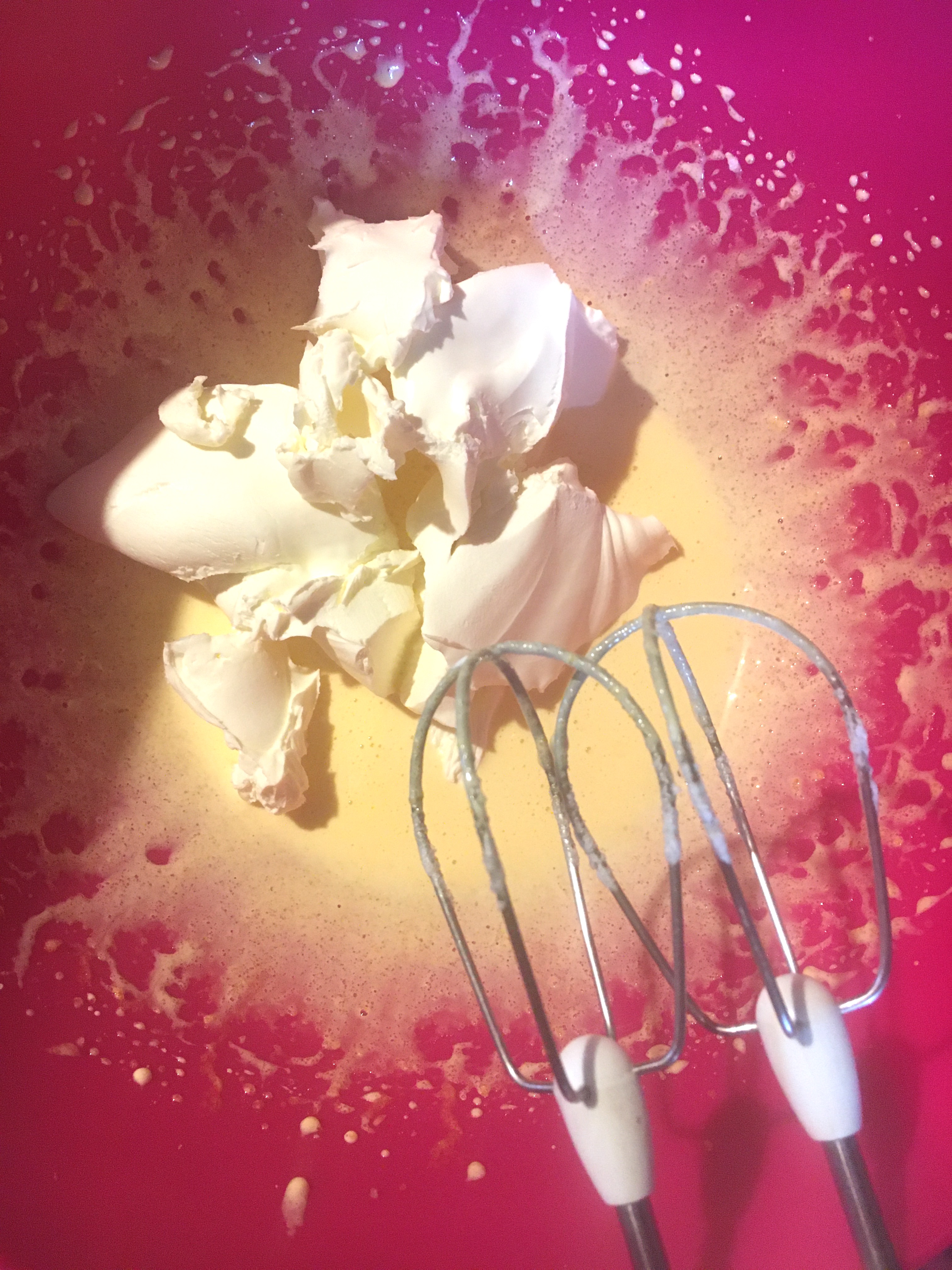 - First beat the whites in their separate bowl until they are stiff and little peaks have formed.